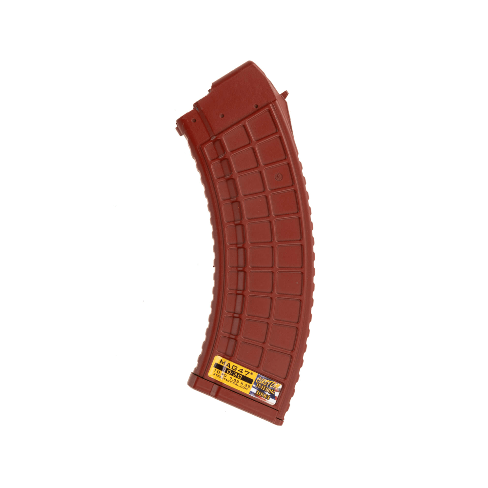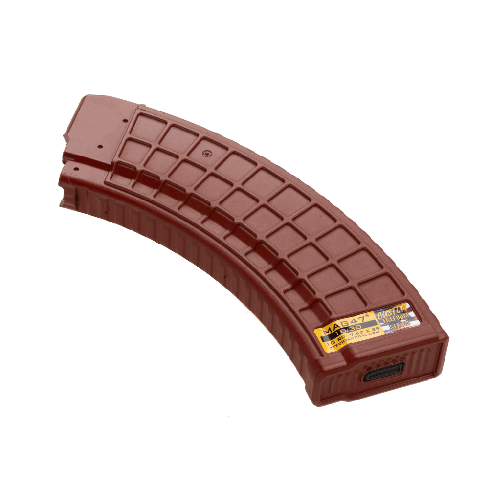 This is the Red 10/30 version of the MAG47 10 Round. The MAG47 is the strongest polymer AK47 magazine to ever be made in the USA. A stainless steel cage reinforces the locking lugs and the feed lips where strength is mission critical. This magazine holds 10 rounds of 7.62 x 39 ammunition and feeds it flawlessly.