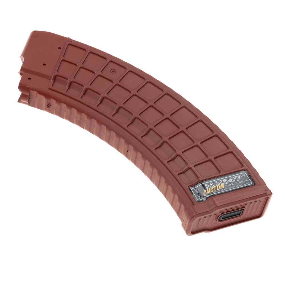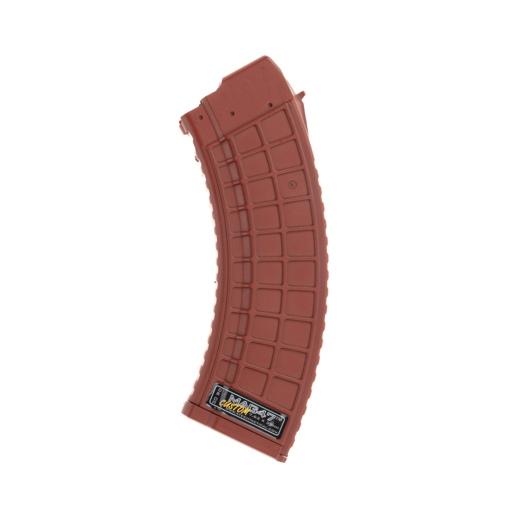 This is a Red version of the MAG47. The MAG47 is the strongest polymer AK47 magazine to ever be made in the USA. A stainless steel cage reinforces the locking lugs and the feed lips where strength is mission critical. This magazine holds 30 rounds of 7.62 x 39 ammunition and feeds it flawlessly.